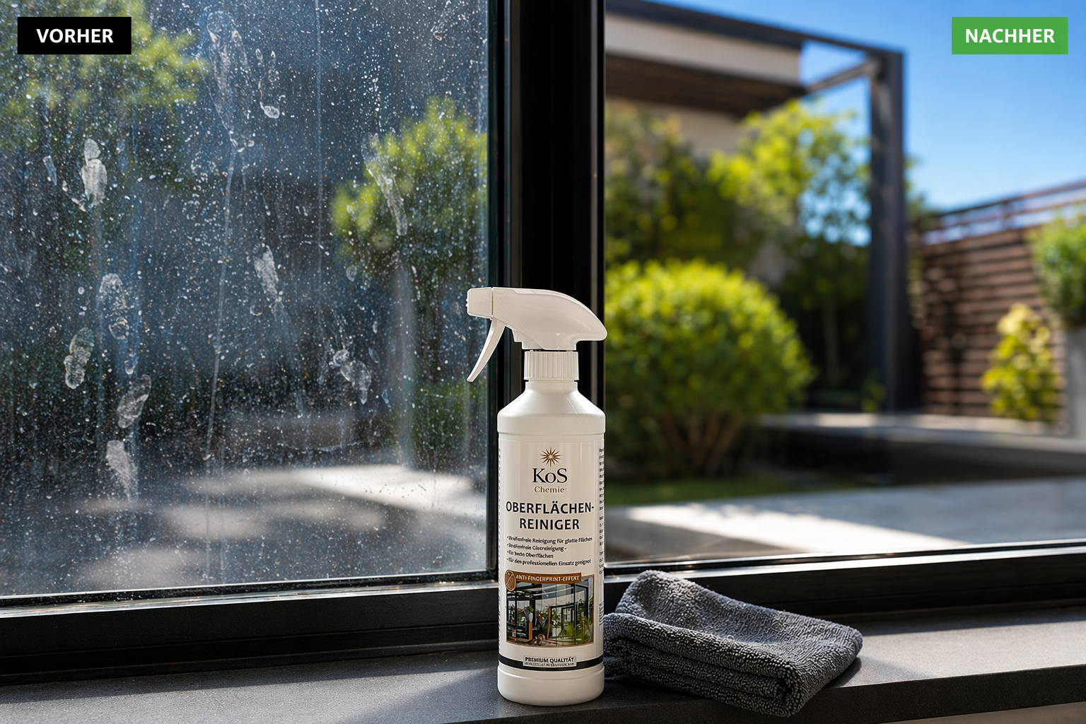 Der KoS Oberflächenreiniger ist die ideale Lösung für die streifenfreie Reinigung aller glatten Oberflächen – im Innen- und Außenbereich.